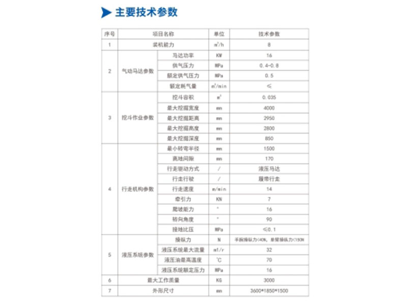 2.體積小移動靈活,礦用氣動巷道挖掘機的設計寬度以井下質(zhì)量標準中人行道寬度zui低0.8米為上限,滿足90%以上的變形巷道施工條件